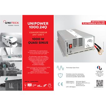UNIPOWER transforme le courant continu 24V de votre batterie en courant alternatif 230V-50Hz.